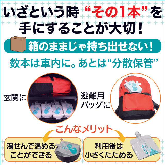 - 【避難バッグや車内に分けて保管】2リットルペットボトルなどの大容量の保存水をお持ちの方にもおすすめの保存水!玄関、バッグの中、車内(トランクやドア内側のポケット)などいろいろな場所に1本ずつ分けて保管するのがオススメです!